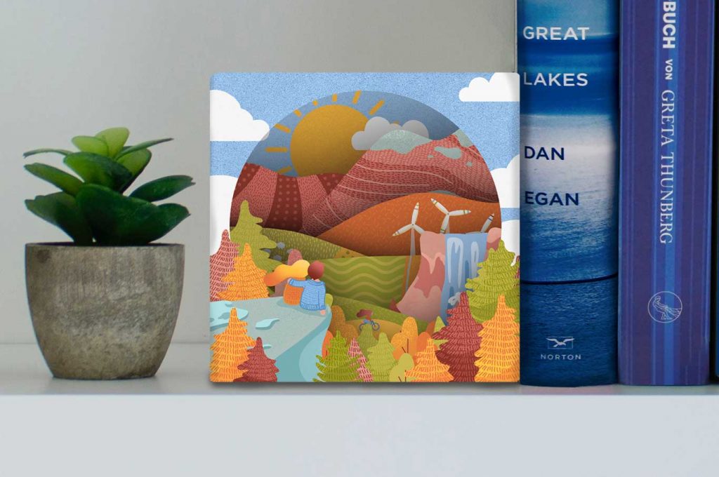 The books are packaged in a box that displays a beautiful mountain landscape. With each book read, you unvail a new layer of the montain view. After pulling out all the books and completing all the challenges it unvails the complete scenery.