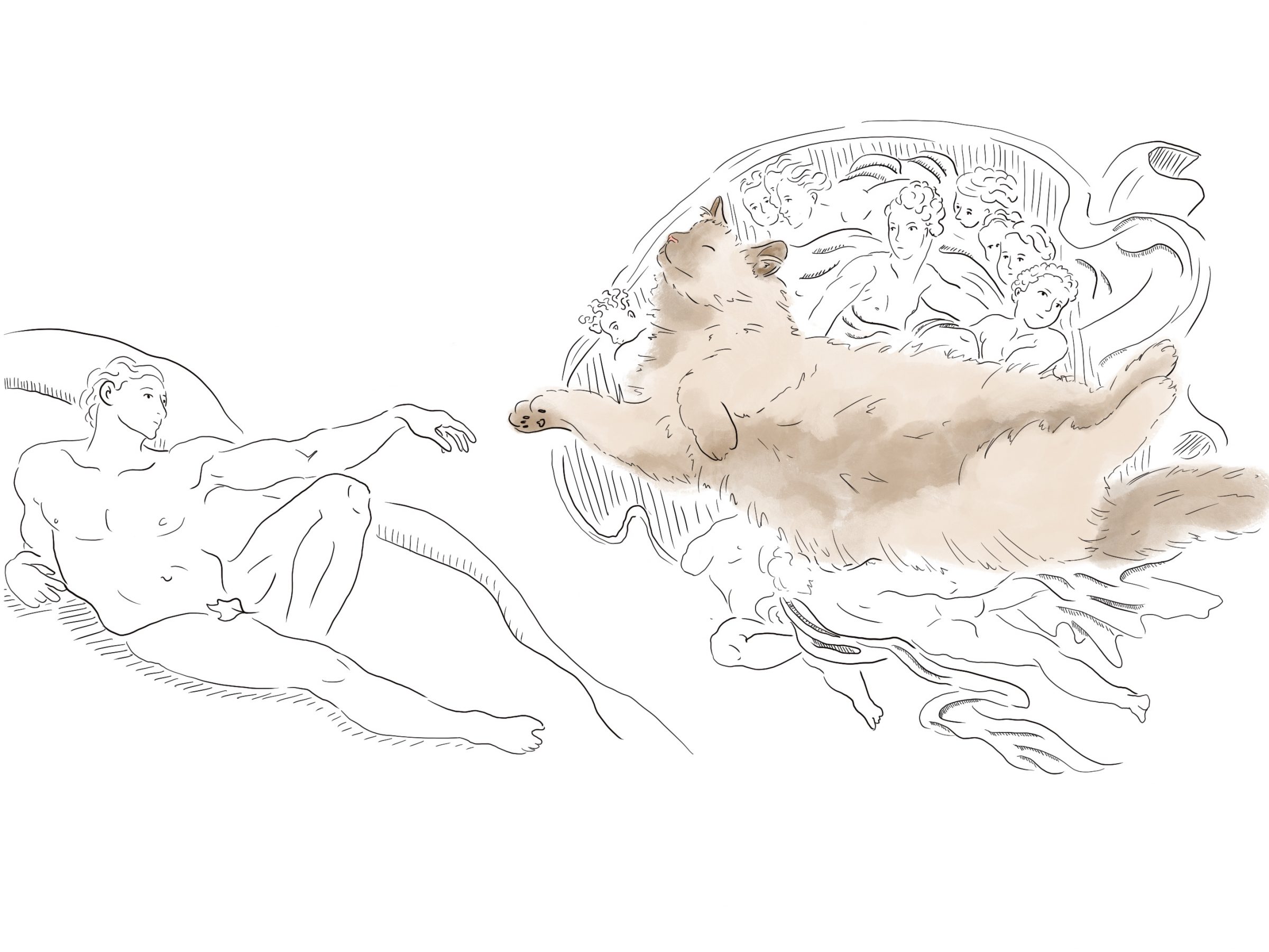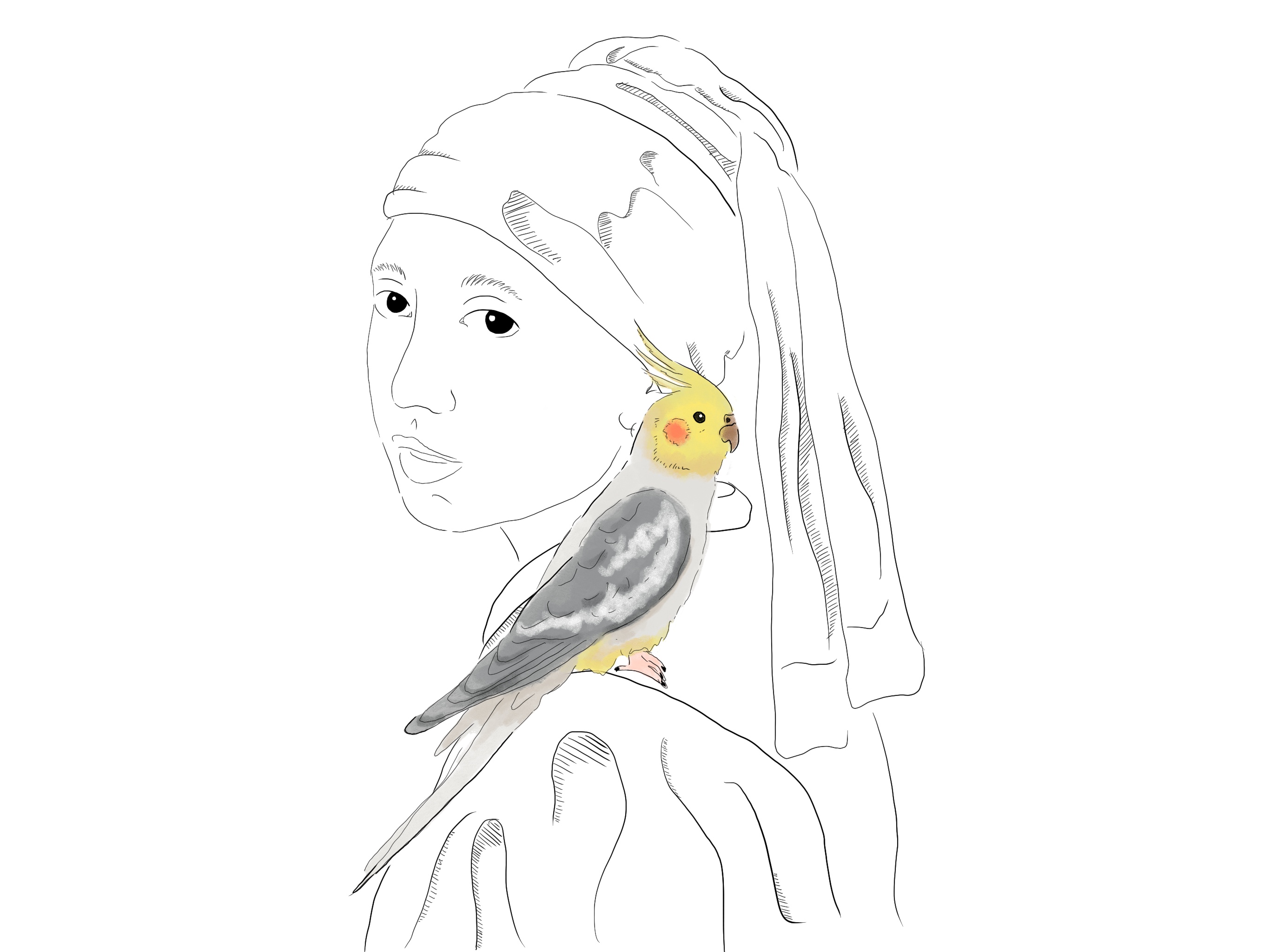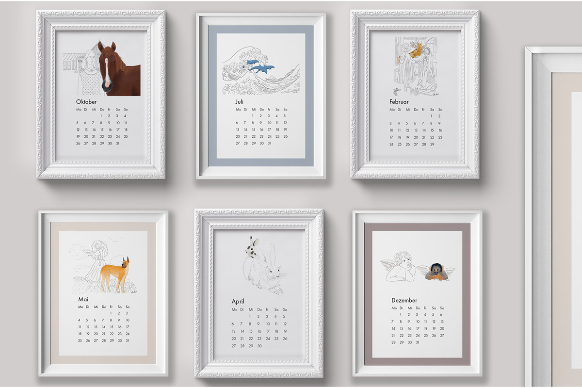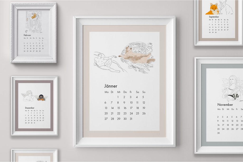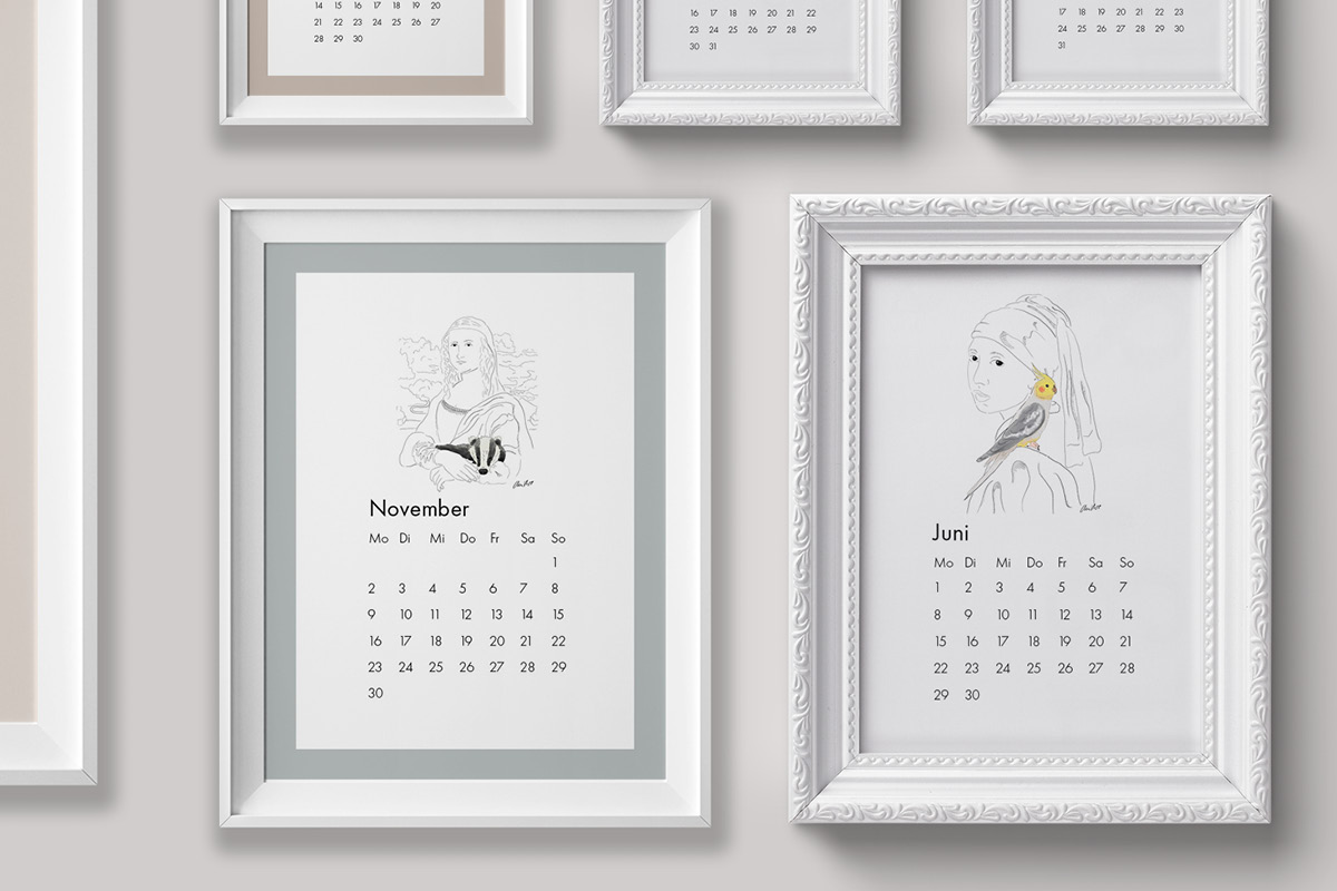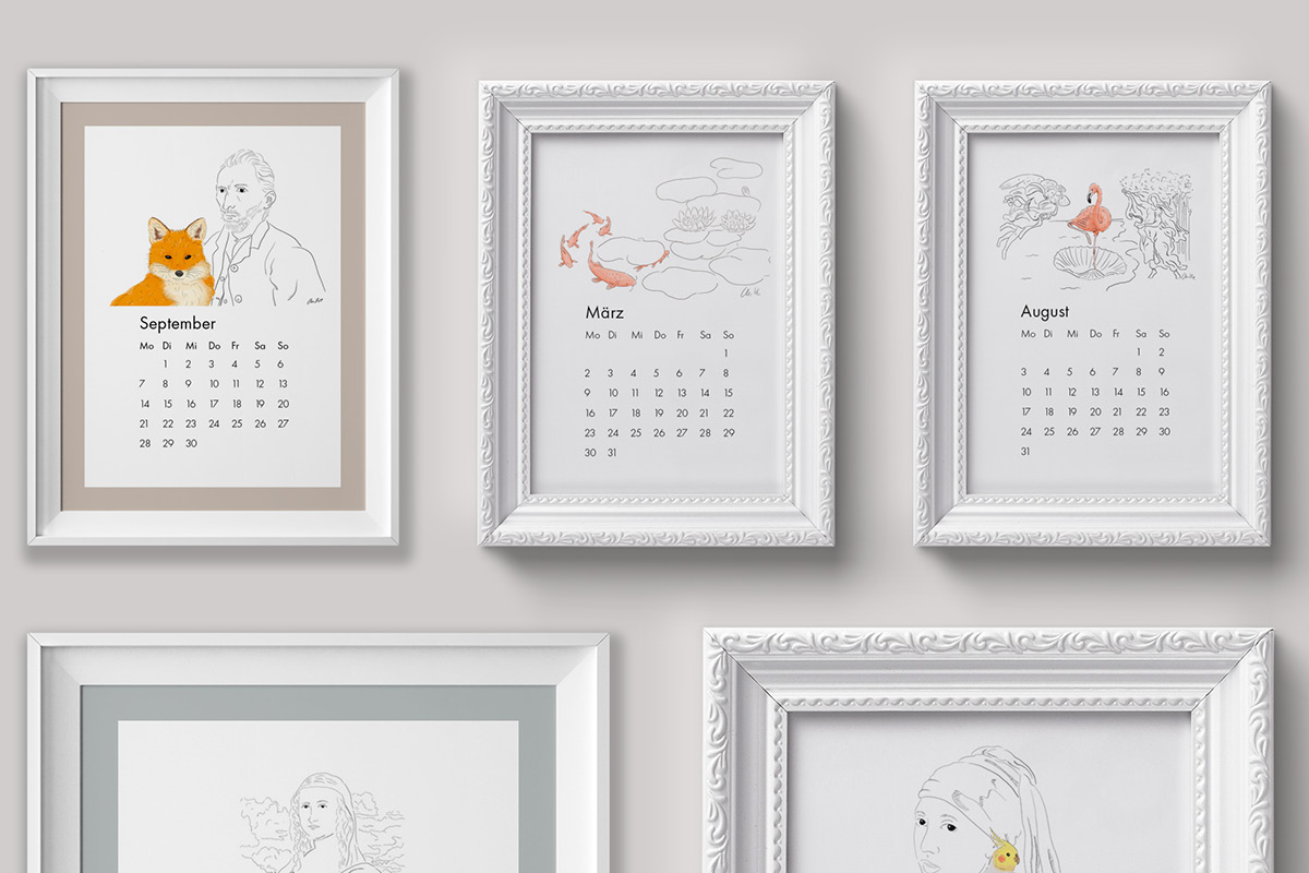 Every year I challenge myself to fi ll a calendar with 12 new illustrations. For the 2020 edition of my calendar I chose to incorporate famous historic paintings and reimagine them in my style. The addition of the animal companions gives the paintings a modern and surreal touch.